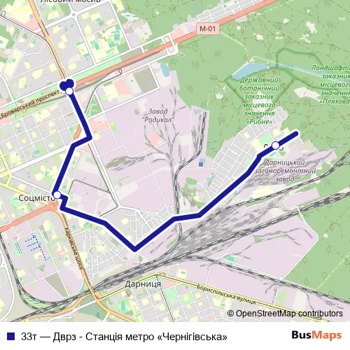 The first stop of the 33т bus route is Дврз and the last stop is ст.м. Чернигівська. 33т (Дврз - Станція метро «Чернігівська») is operational during по будням.