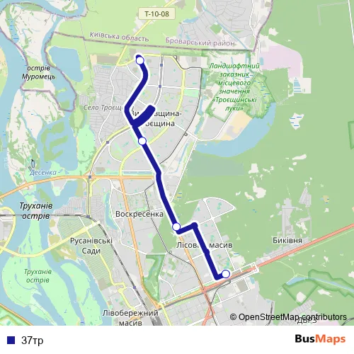 The first stop of the 37тр bus route is ст.м. Лісова and the last stop is вул. Милославська (73). 37тр is operational during ежедневно.