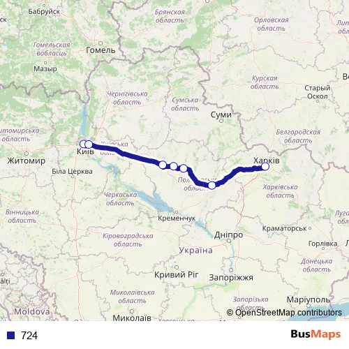 The first stop of the 724 rail route is Київ-Пасажирський and the last stop is Харків-Пасажирський. 724 is operational during ежедневно.