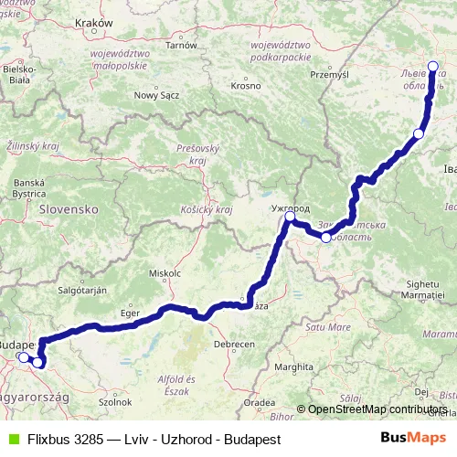 The first stop of the Flixbus 3285 bus route is Lviv (Stryiskyi Bus Station) and the last stop is Budapest Népliget bus station. Flixbus 3285 (Lviv - Uzhorod - Budapest) is operational during по выходным.