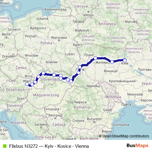 The first stop of the Flixbus N3272 bus route is Vienna Erdberg (Busterminal Vib) and the last stop is Kyiv (Central Bus Station). Flixbus N3272 (Kyiv - Kosice - Vienna) is operational during ежедневно.