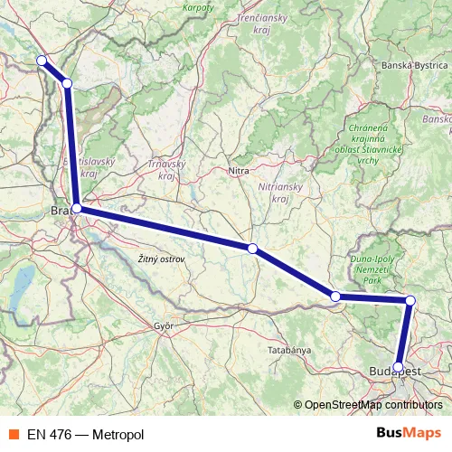 The first stop of the EN 476 rail route is Budapest-Nyugati pu and the last stop is Břeclav. EN 476 (Metropol) is operational during denne.
