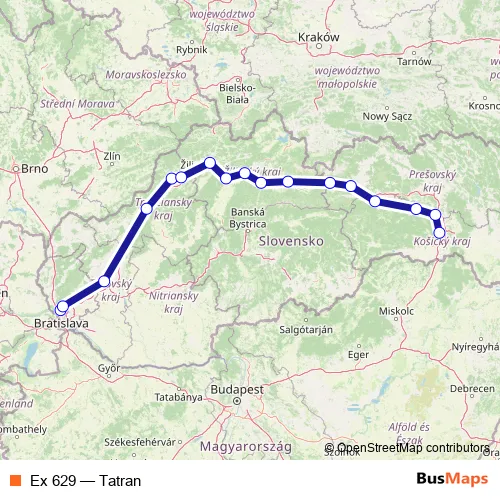 The first stop of the Ex 629 rail route is Bratislava hl.st. and the last stop is Košice. Ex 629 (Tatran) is operational during denne.