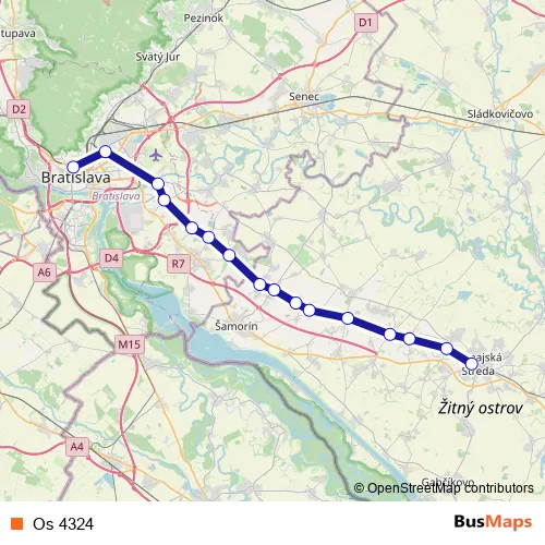 The first stop of the Os 4324 rail route is Dunajská Streda and the last stop is Bratislava hl.st.. Os 4324 is operational during denne.