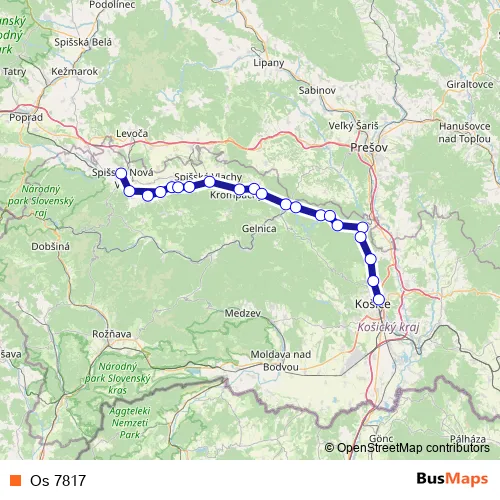 The first stop of the Os 7817 rail route is Spišská Nová Ves and the last stop is Košice. Os 7817 is operational during v pracovné dni.