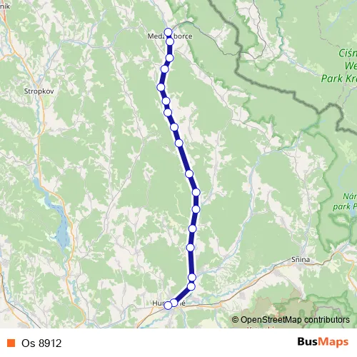 The first stop of the Os 8912 rail route is Medzilaborce mesto and the last stop is Humenné. Os 8912 is operational during denne.