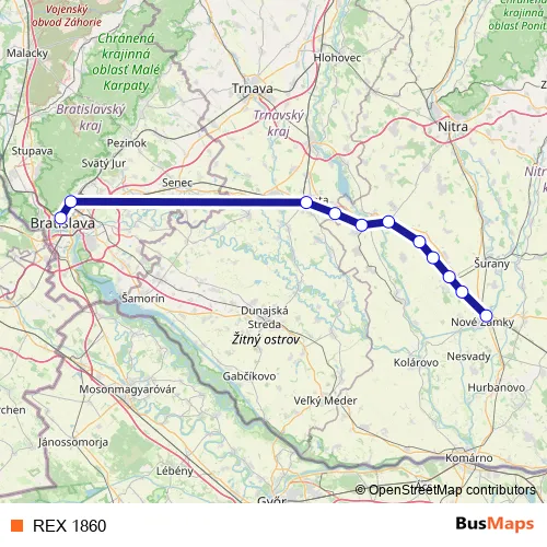 The first stop of the REX 1860 rail route is Nové Zámky and the last stop is Bratislava hl.st.. REX 1860 is operational during v pracovné dni.