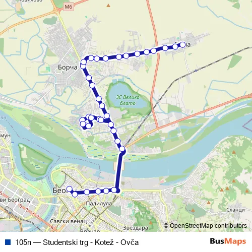 The first stop of the 105n bus route is Studentski trg and the last stop is Ovča /centar/. 105n (Studentski trg - Kotež - Ovča) is operational during svakodnevno.
