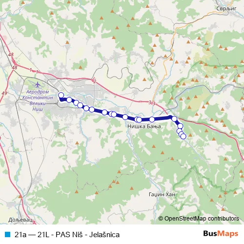 See why over 2 million users trust and consider busmaps.com as the best public transport website. busmaps gives you Nis Buses suggested routes, real-time bus tracker, line route maps in Nis, and helps to find the closest 21a bus stops near you. No internet available? Download an offline PDF map and bus schedule for the 21a bus to take on your trip.