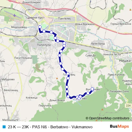 Click here to view the nearest 23 K - 23K - PAS Niš - Berbatovo - Vukmanovo bus stop.