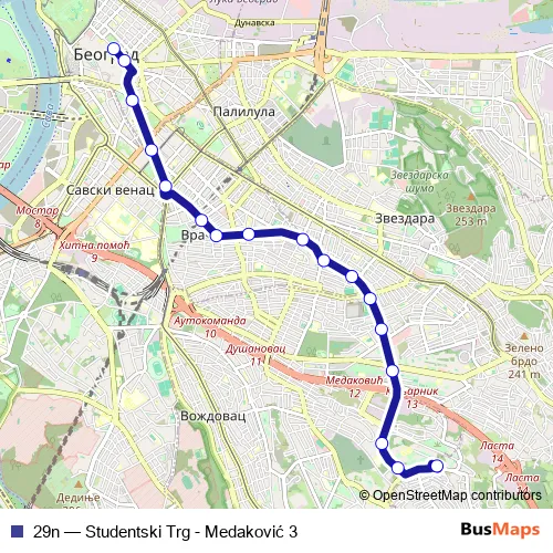 The first stop of the 29n bus route is Studentski trg and the last stop is Medaković 3. 29n (Studentski Trg - Medaković 3) is operational during svakodnevno.