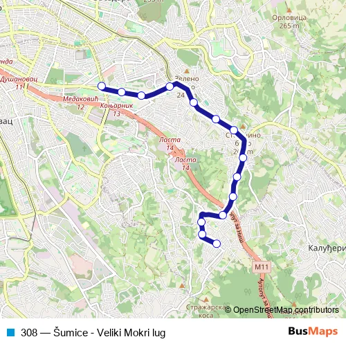 The first stop of the 308 bus route is Vml and the last stop is Šumice. 308 (Šumice - Veliki Mokri lug) is operational during svakodnevno.
