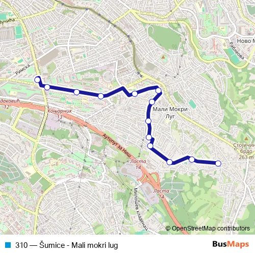 The first stop of the 310 bus route is Šumice and the last stop is Mali mokri lug (crkva). 310 (Šumice - Mali mokri lug) is operational during svakodnevno.