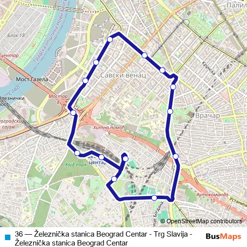 The first stop of the 36 bus route is Železnička stanica BGD centar and the last stop is Železnička stanica BGD centar. 36 (Železnička stanica Beograd Centar - Trg Slavija - Železnička stanica Beograd Centar) is operational during svakodnevno.