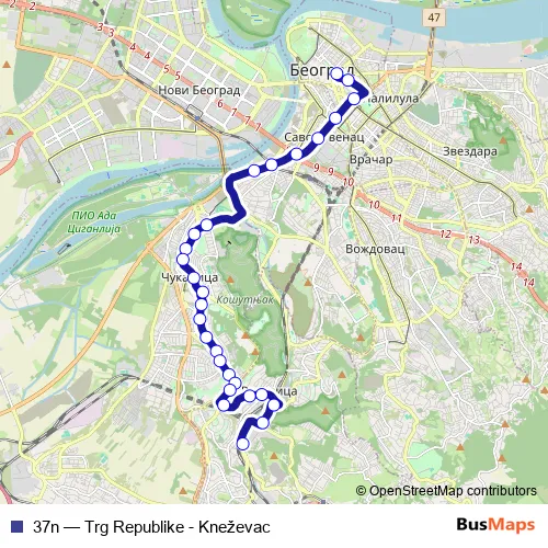 The first stop of the 37n bus route is Trg Republike and the last stop is Kneževac. 37n (Trg Republike - Kneževac) is operational during svakodnevno.