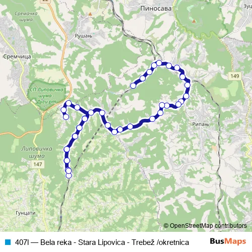 The first stop of the 407l bus route is Bela reka and the last stop is Trebež (okretnica). 407l (Bela reka - Stara Lipovica - Trebež /okretnica) is operational during svakodnevno.