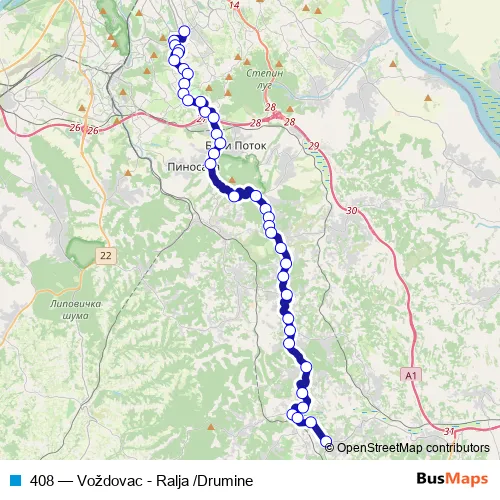 The first stop of the 408 bus route is Voždovac and the last stop is Ralja /Drumine. 408 (Voždovac - Ralja /Drumine) is operational during svakodnevno.