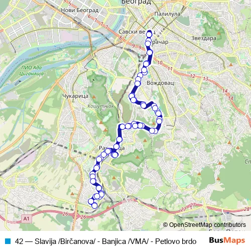 Bus 42 - Slavija /Birčanova/ - Banjica /VMA/ - Petlovo brdo: Full Schedule in Belgrade