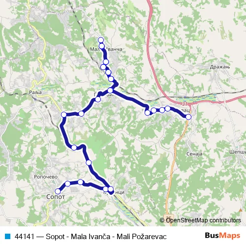 The first stop of the 44141 bus route is Sopot As and the last stop is Mali Požarevac - Raskrsnica. 44141 (Sopot - Mala Ivanča - Mali Požarevac) is operational during svakodnevno.
