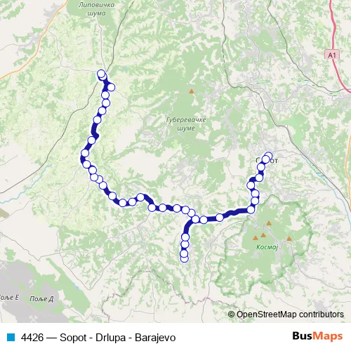 The first stop of the 4426 bus route is Sopot As and the last stop is Barajevo As. 4426 (Sopot - Drlupa - Barajevo) is operational during radnim danima.