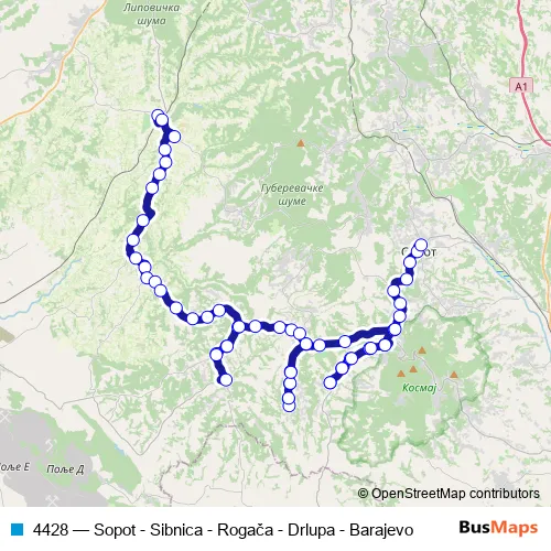 The first stop of the 4428 bus route is Barajevo As and the last stop is Sopot As. 4428 (Sopot - Sibnica - Rogača - Drlupa - Barajevo) is operational during radnim danima.