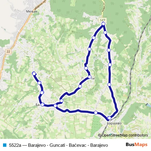 The first stop of the 5522a bus route is Barajevo As and the last stop is Barajevo As. 5522a (Barajevo - Guncati - Baćevac - Barajevo) is operational during svakodnevno.