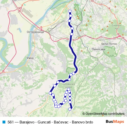 The first stop of the 561 bus route is Barajevo As and the last stop is Banovo brdo. 561 (Barajevo - Guncati - Baćevac - Banovo brdo) is operational during svakodnevno.
