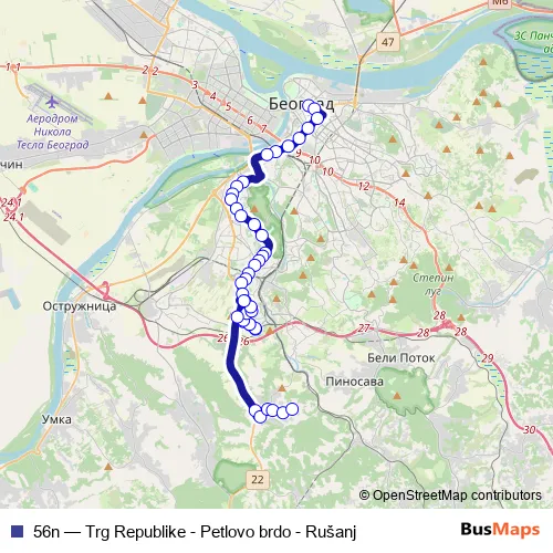 Bus 56n - Trg Republike - Petlovo brdo - Rušanj in Belgrade: Stops & Timetable