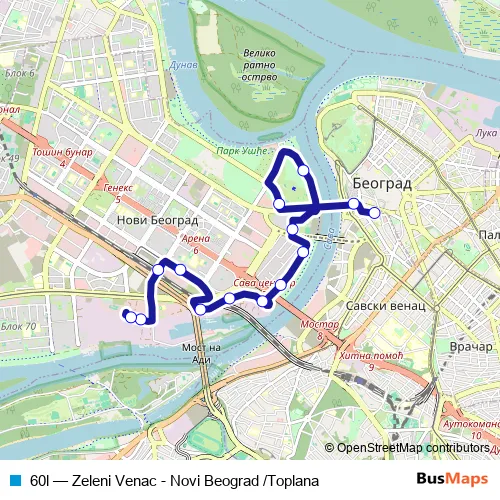 The first stop of the 60l bus route is Zeleni venac and the last stop is Toplana. 60l (Zeleni Venac - Novi Beograd /Toplana) is operational during svakodnevno.
