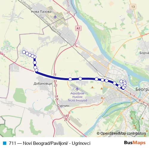 Click here to view the nearest 711 - Novi Beograd/Paviljoni/ - Ugrinovci bus stop.