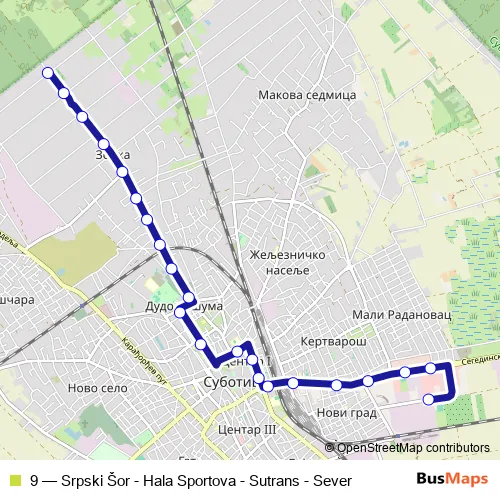 The first stop of the 9 bus route is Široki Progon and the last stop is Subotica - Sever. 9 (Srpski Šor - Hala Sportova - Sutrans - Sever) is operational during radnim danima.
