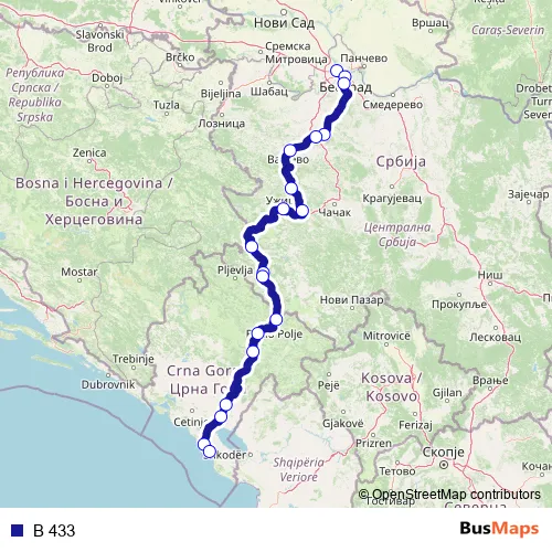 The first stop of the B 433 rail route is Zemun and the last stop is Bar. B 433 is operational during svakodnevno.