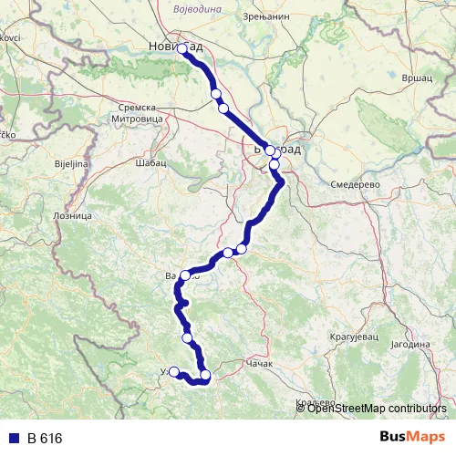 The first stop of the B 616 rail route is Užice and the last stop is Petrovaradin. B 616 is operational during svakodnevno.