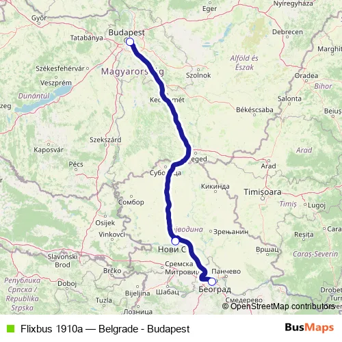 The first stop of the Flixbus 1910a bus route is Belgrade bus station and the last stop is Budapest Népliget bus station. Flixbus 1910a (Belgrade - Budapest) is operational during svakodnevno.