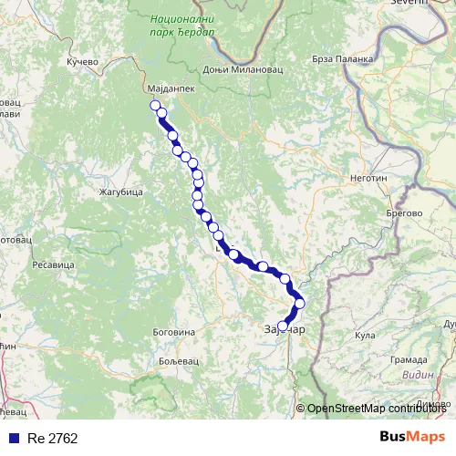 The first stop of the Re 2762 rail route is Zaječar and the last stop is Majdanpek. Re 2762 is operational during svakodnevno.