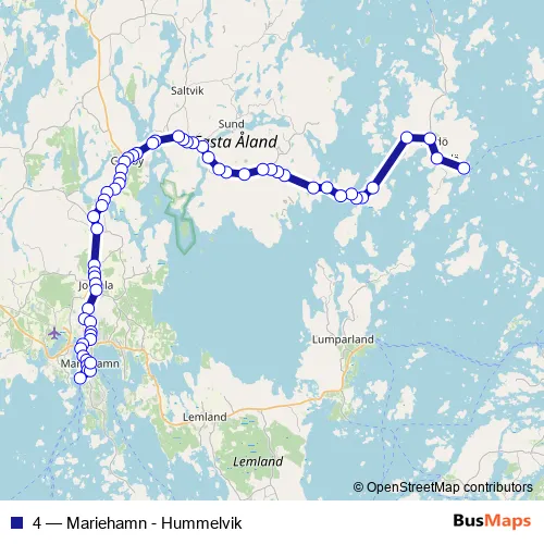 The first stop of the 4 bus route is Hummelvik and the last stop is Mariehamn, Bussplan. 4 (Mariehamn - Hummelvik) is operational during varje dag.
