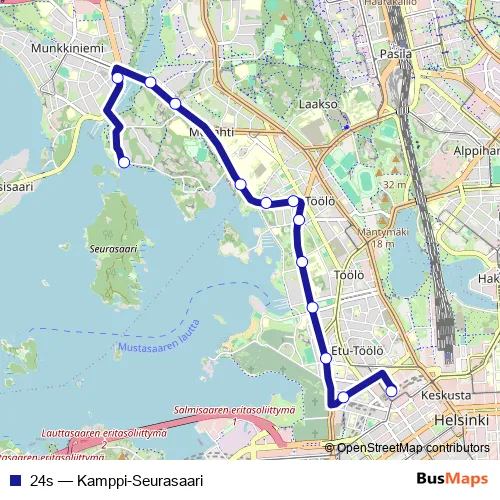 See why over 2 million users trust and consider busmaps.com as the best public transport website. busmaps gives you Helsinki Buses suggested routes, real-time bus tracker, line route maps in Helsinki, and helps to find the closest 24s bus stops near you. No internet available? Download an offline PDF map and bus schedule for the 24s bus to take on your trip.