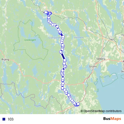 The first stop of the 103 bus route is Säffle station and the last stop is Arvika busstation/Solbergsgränd. 103 is operational during varje dag.