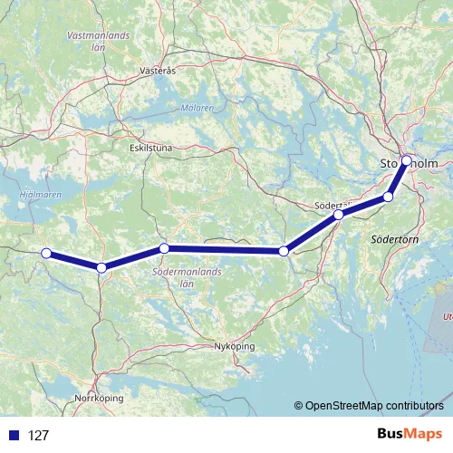 The first stop of the 127 rail route is Stockholm Centralstation and the last stop is Vingåker station. 127 is operational during varje dag.