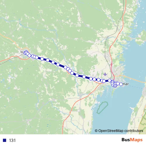 The first stop of the 131 bus route is Nybro station and the last stop is Kalmar Centralstation. 131 is operational during varje dag.