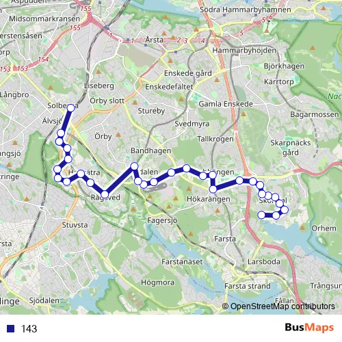 The first stop of the 143 bus route is Hökarängen T-bana and the last stop is Älvsjö station. 143 is operational during varje dag.