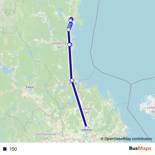 The first stop of the 150 bus route is Hudiksvall sjukhuset and the last stop is Uppsala Akademiska ing 78-85. 150 is operational during på vardagar.