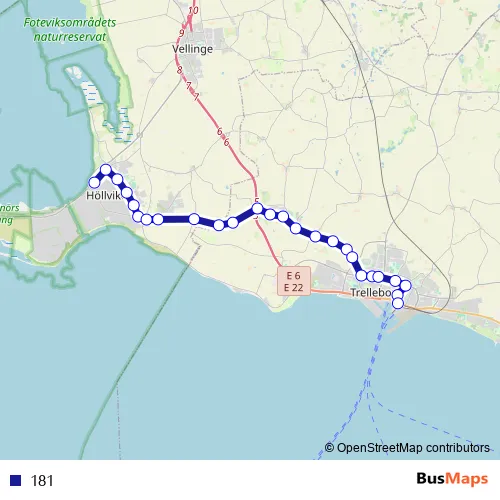 The first stop of the 181 bus route is Höllviken centrum and the last stop is Trelleborg Centralstation. 181 is operational during varje dag.