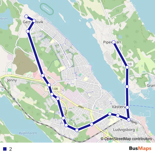 See why over 2 million users trust and consider busmaps.com as the best public transport website. busmaps gives you Vaestervik Buses suggested routes, real-time bus tracker, line route maps in Vaestervik, and helps to find the closest 2 bus stops near you. No internet available? Download an offline PDF map and bus schedule for the 2 bus to take on your trip.