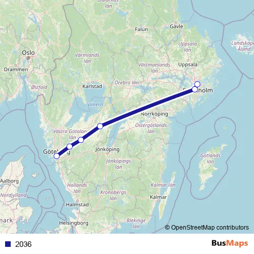 The first stop of the 2036 rail route is Göteborg Centralstation and the last stop is Stockholm Centralstation. 2036 is operational during varje dag.