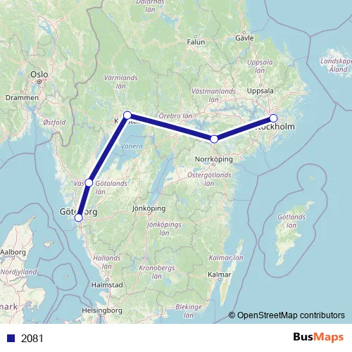 The first stop of the 2081 rail route is Stockholm Centralstation and the last stop is Göteborg Centralstation. 2081 is operational during på helger.