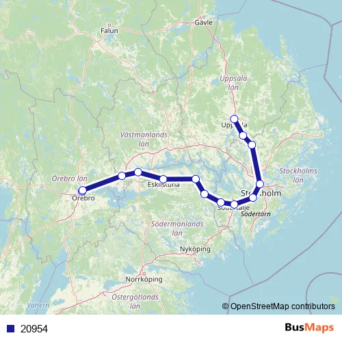 The first stop of the 20954 rail route is Örebro Södra station and the last stop is Uppsala Centralstation. 20954 is operational during på vardagar.
