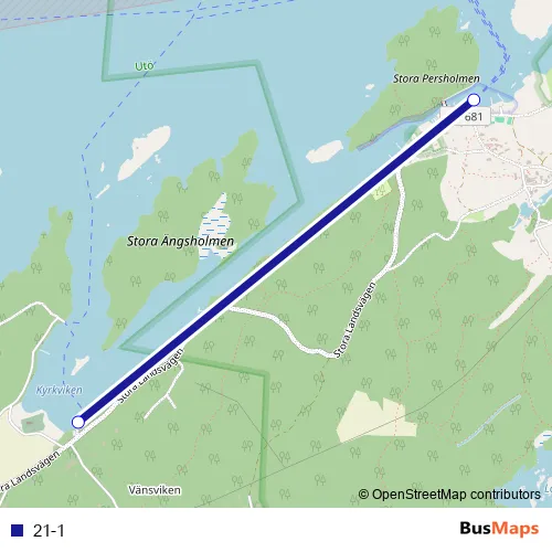 The first stop of the 21-1 ferry route is Utö Gruvbryggan brygga and the last stop is Spränga (Utö) brygga. 21-1 is operational during på vardagar.