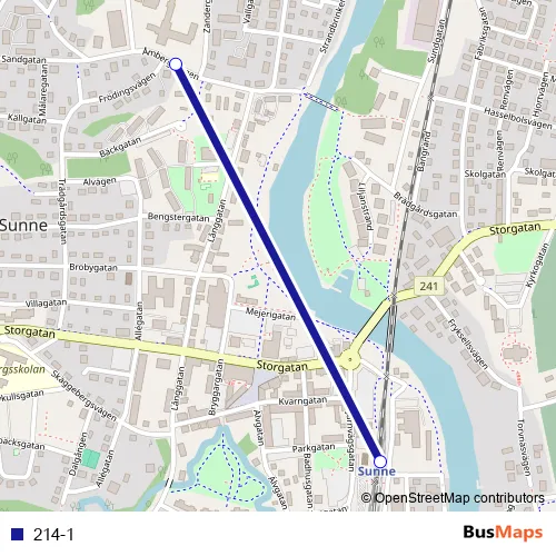 The first stop of the 214-1 bus route is Sunne station and the last stop is Sunne, Vårdcentralen. 214-1 is operational during på vardagar.