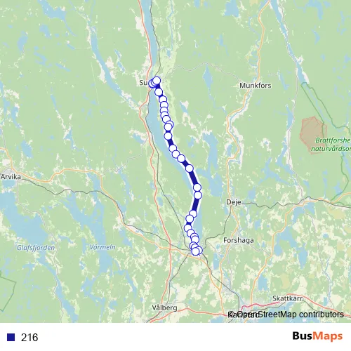 The first stop of the 216 bus route is Sunne station and the last stop is Kil station. 216 is operational during på vardagar.